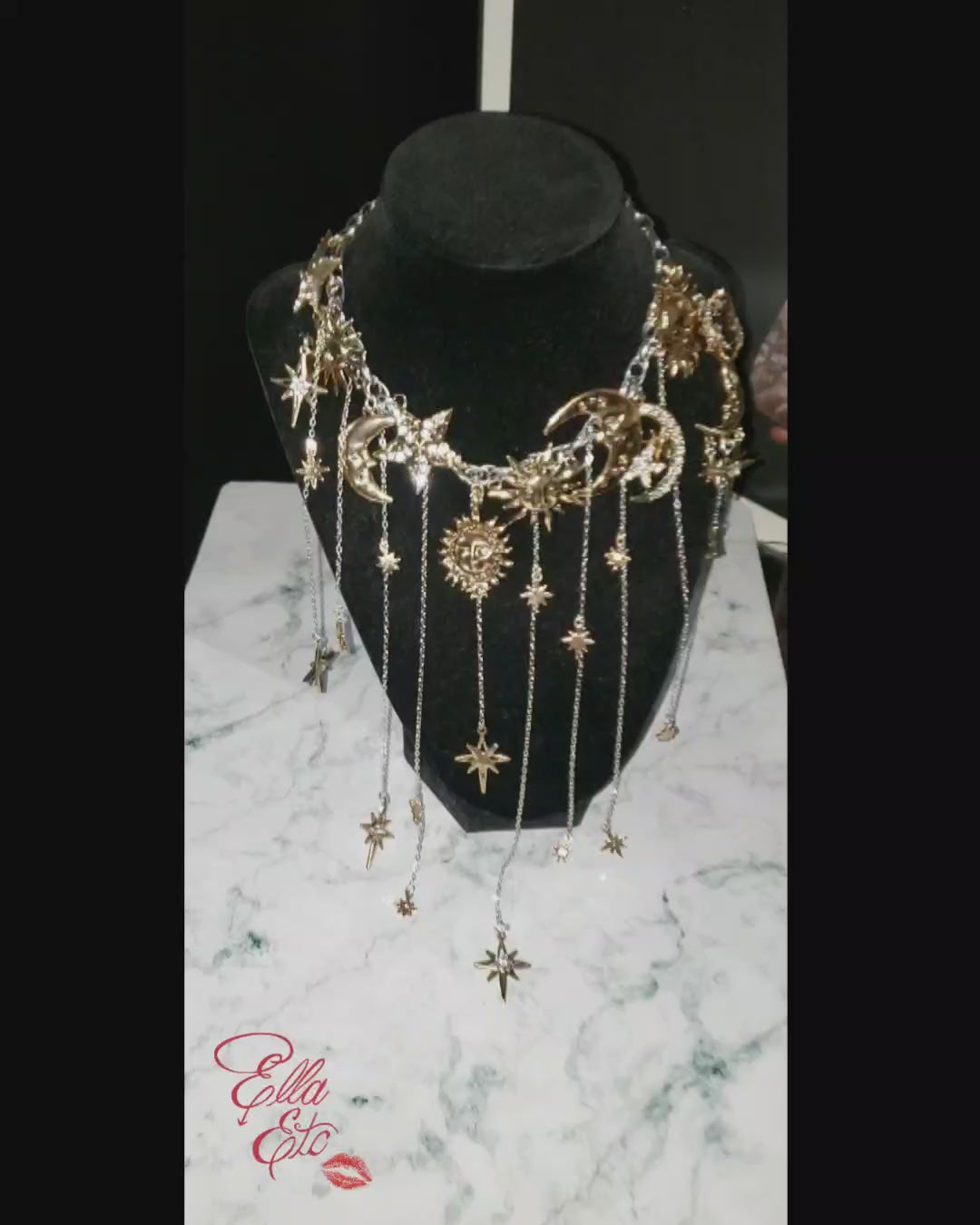 The Cosmic Empress Necklace is a commanding celestial statement designed for the woman who leads with confidence and presence. Featuring sculptural moon and sun motifs accented by cascading star-adorned fringe chains, this piece drapes the neckline in bold, goddess-worthy elegance.
